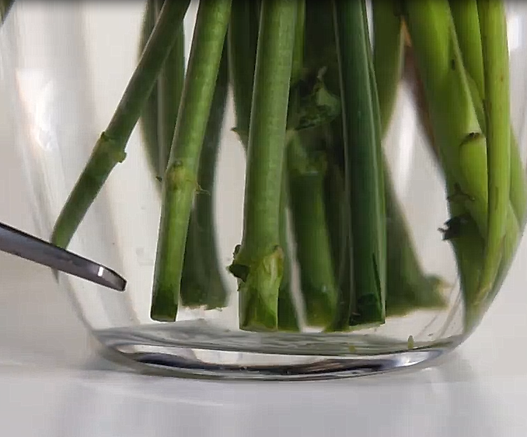 Como puedes observar los tallos tiene un corte plano el cual al tocar con el fondo del recipiente obstruye la correcta hidratación de las flores por lo tanto lo que debes realizar es un corte diagonal en cada uno de los tallos.