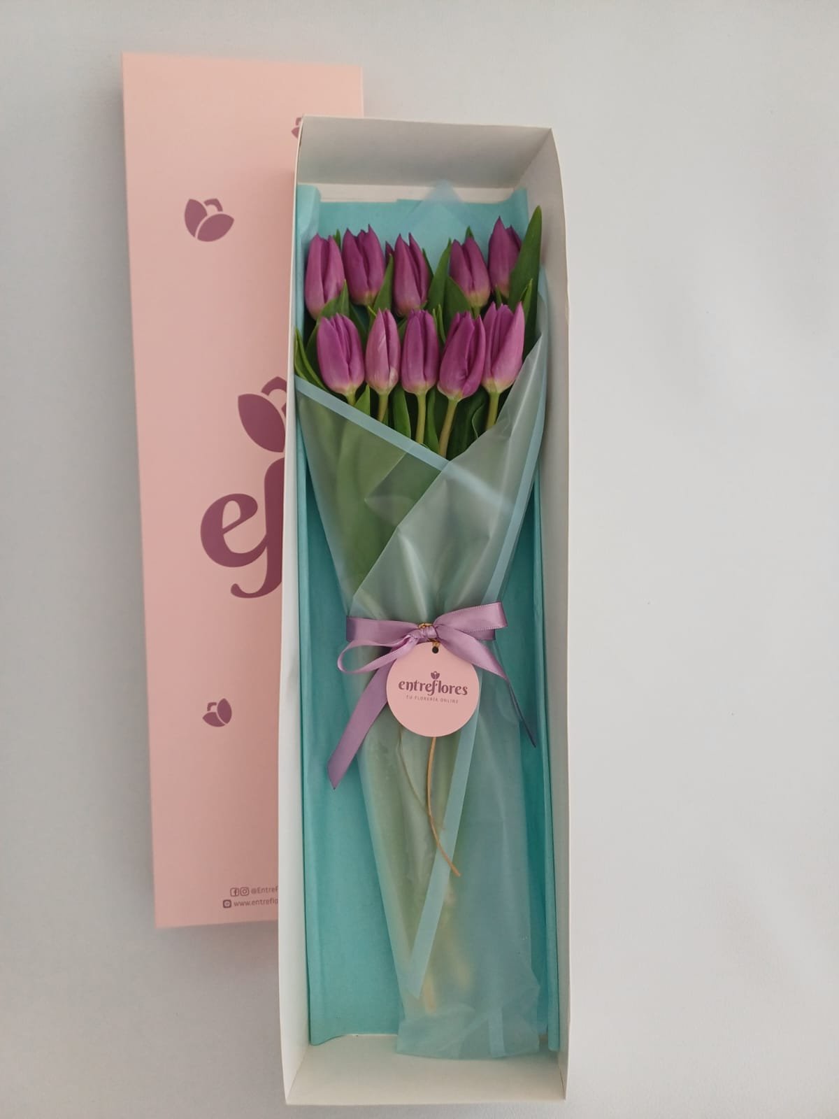10 hermosos tulipanes (1 solo color)son los protagonistas decorado con bellos papeles coreanos y lazos. Siempre acompañado de la tarjeta con dedicatoria personalizada.