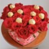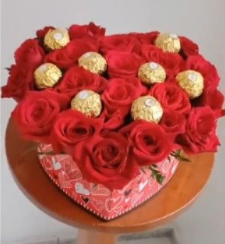 De 18 a 22 rosas rojas(hay variación de color), follaje, 8 bombones Ferrero Roche en hermoso box en forma de corazón.