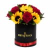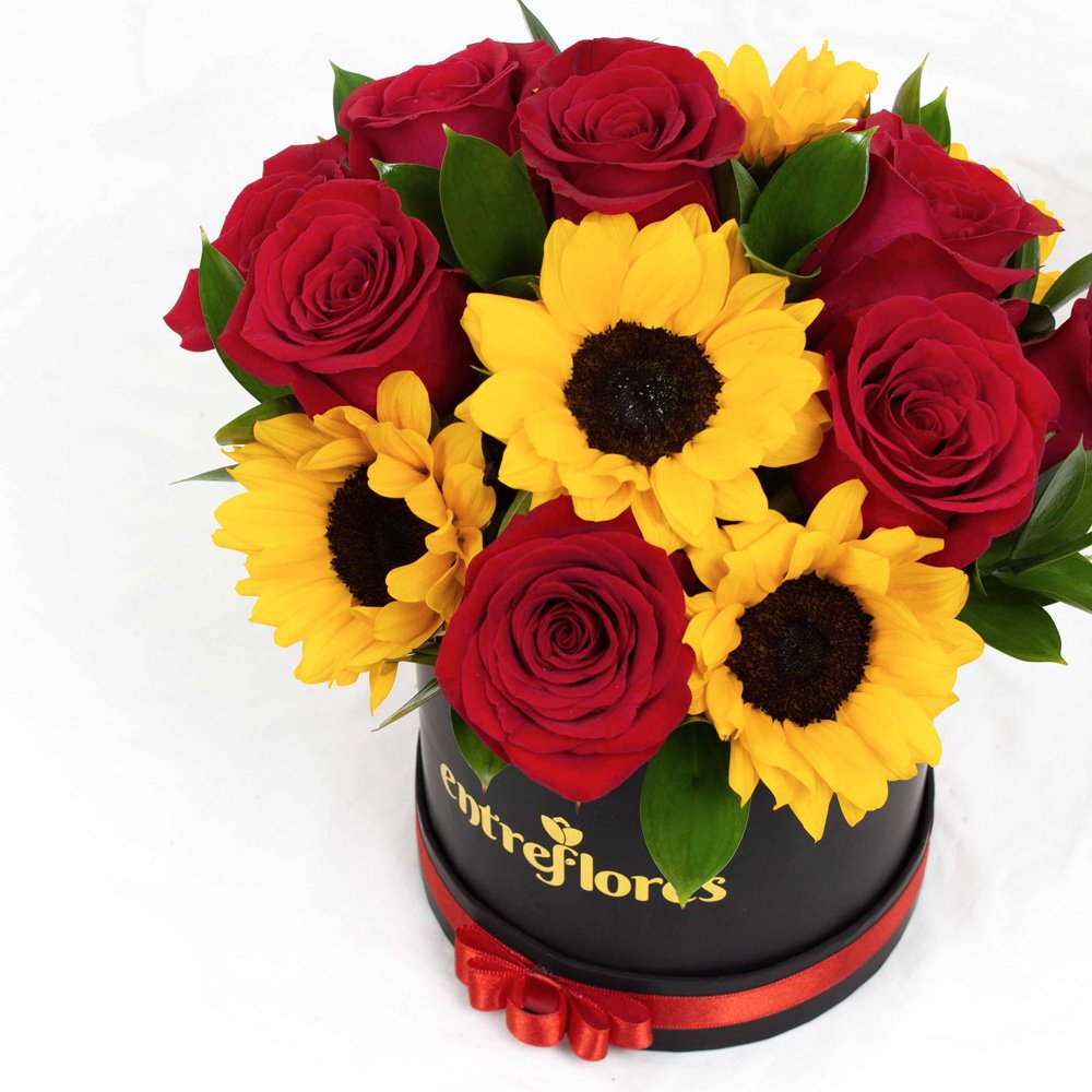 6 Girasoles, 9 Rosas, Ruscus y box de 15 cm